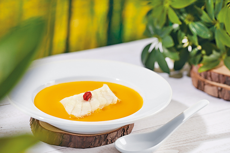 六道菜套餐豐富。鷓鴣、杞子、蟲草花及果皮等熬湯,藉紫砂壺保存養分,杞子蟲草花燉鷓鴣鮮甜清香。南瓜汁豆乳鮮斑件(見圖)色彩漂亮,以金絲瓜、上湯及豆乳煮香滑南瓜汁,黃皮老虎斑片爽彈鮮味,瓜甜匹配魚鮮。套餐還包括胡麻海帶黑木耳青瓜絲、山藥蜜豆炒鴿脯、五穀米蟹肉蒸飯、薑汁紅棗糕及蛋白杏仁茶,這頓定捧腹歸家。