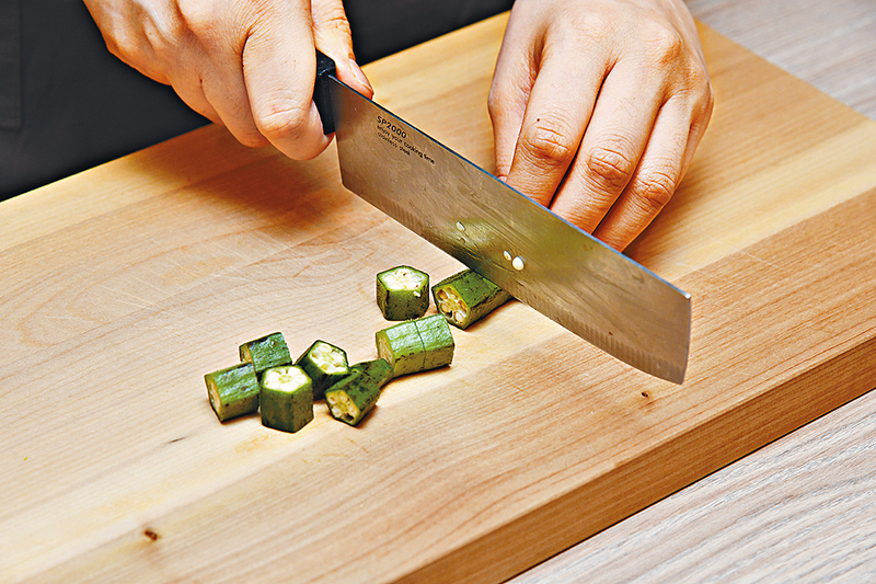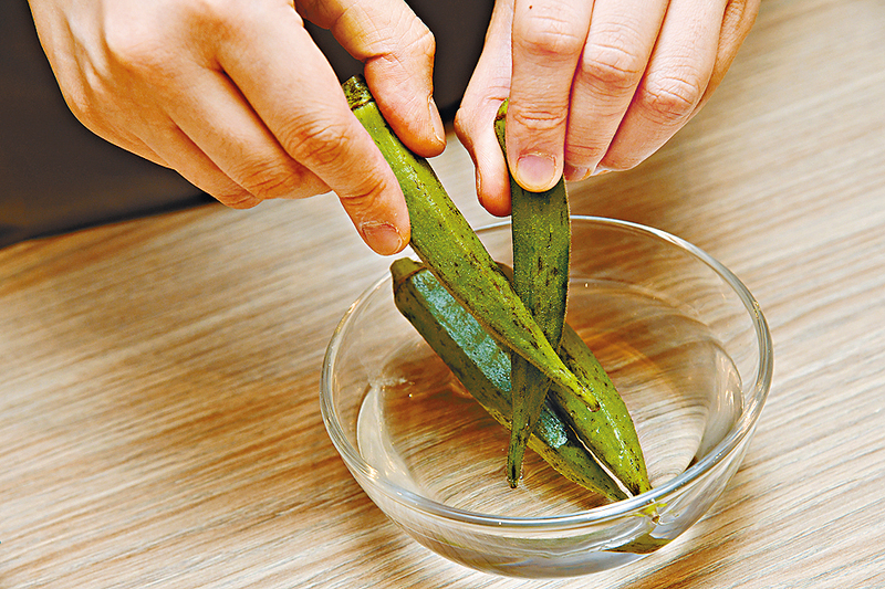 秋葵外皮長滿細絨毛,得用鹽巴逐一搓擦,去掉絨毛,再用小刀削去蒂邊硬皮,那口感便順滑多。叫人又愛又恨的,是秋葵內裏滑潺潺的黏液,千萬別刮掉,黏液含豐富果膠及水溶性纖維,有助腸胃道蠕動,更能附 胃黏膜,保護胃壁,所以原條吃最有益。