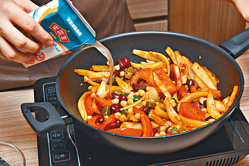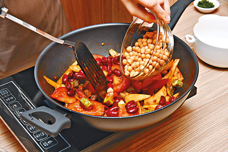 3.加入秋葵、鷹嘴豆及紅腰豆炒勻。