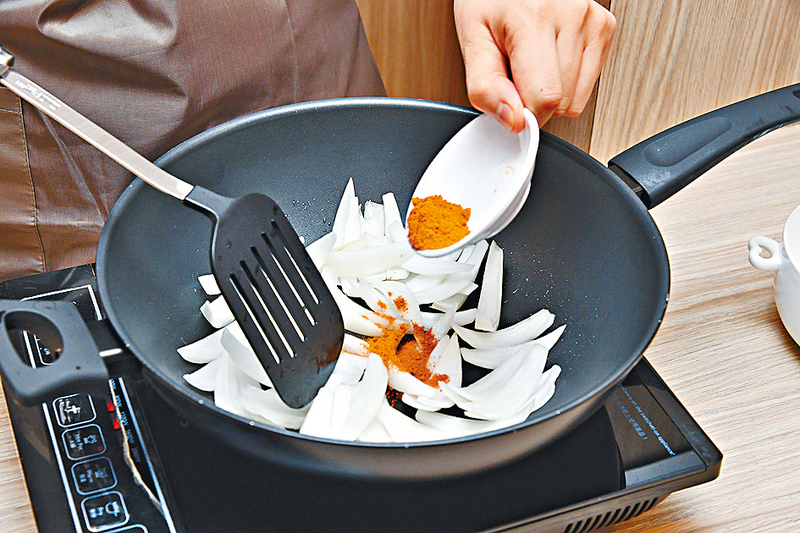 2.起油鑊,爆香洋葱、咖喱粉和辣椒粉,炒至洋葱軟身,加入番茄及糖略炒。