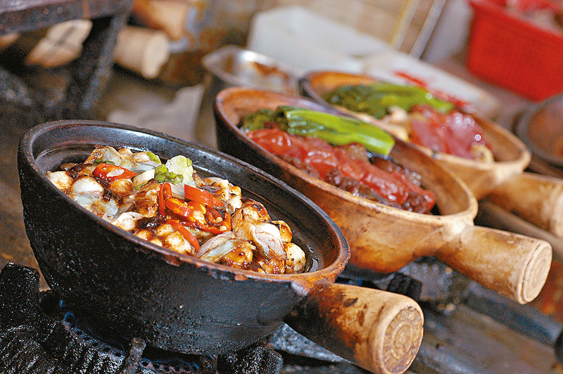 秋冬吃煲仔飯最過癮。洗淨金蠔、臘腸、 腸。煎香金蠔,臘腸和膶腸切段。在砂鍋中煮飯至約七成熟,即飯還濕潤時,將金蠔和臘味置飯面,煮至飯熟,撒一把葱花,澆一圈醬油,香氣四溢。