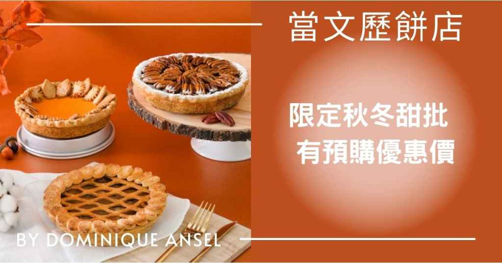 當文歷餅店 by Dominique Ansel推出三款秋冬限定甜批,焦糖碧根果仁批於上年感恩節已面世,而另外兩款甜批,海鹽焦糖蘋果批和經典南瓜批則是首次隆重登場。當文歷餅店主廚 Dominique Ansel 表示:「感恩節或聖誕節聚餐都需要傳統甜批作結才算圓滿。