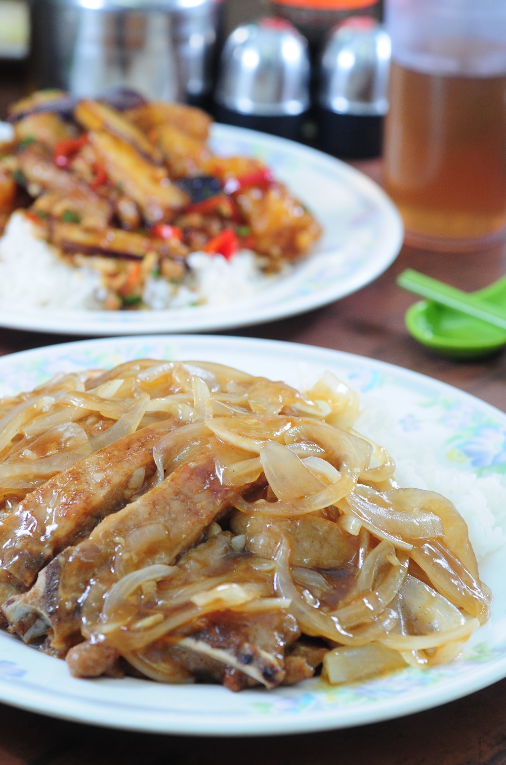 碟頭飯以洋蔥豬扒飯最受熱捧,選用巴西豬扒,再以洋蔥、大量蔬菜熬汁成醃料醃製豬扒,再用豬骨、響螺等材料熬湯以烹飪芡汁,此外又用上大量洋蔥煮洋蔥汁,豬扒煎得金黃香脆但依然肉質鬆化,洋蔥味滿瀉,加上堅持柯打後才煮,絕對非坊間粗製濫造的豬扒飯可比。