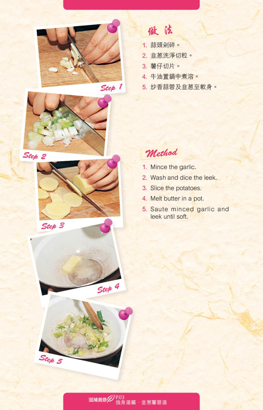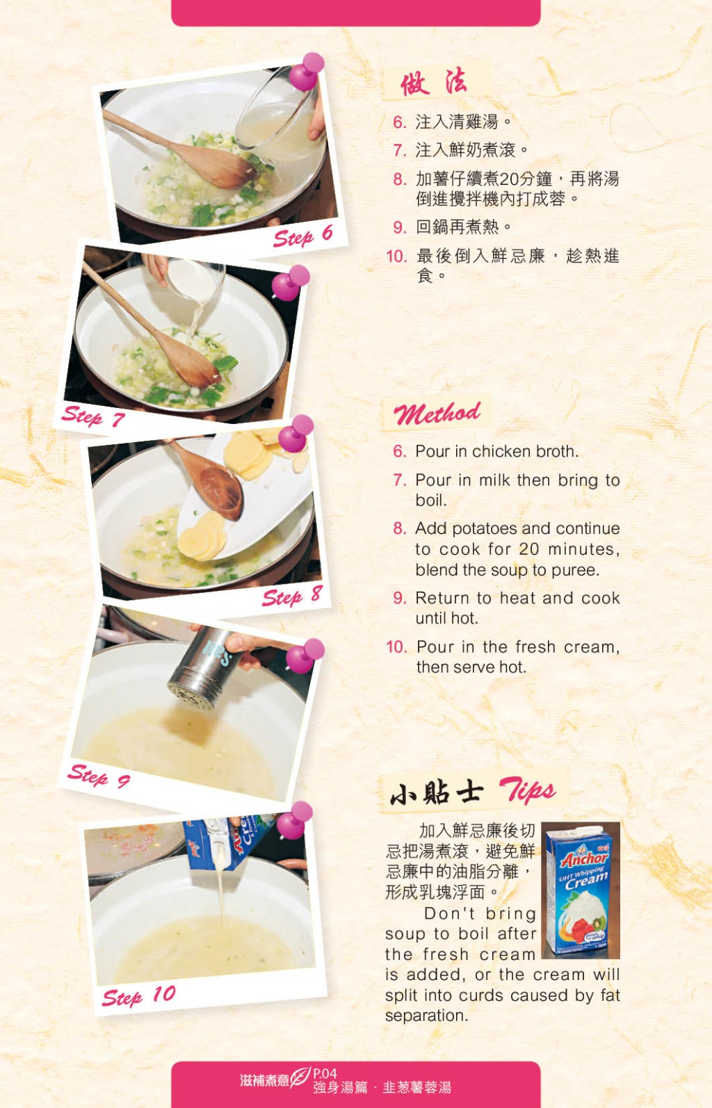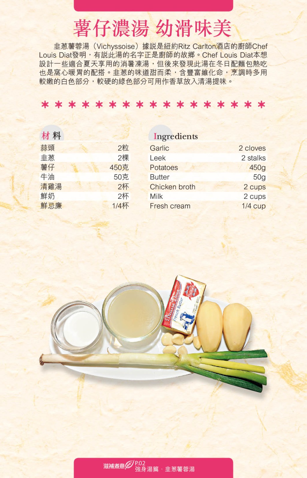 用薯仔煮湯,中式做法多將薯仔切件,保留口感,西式煮法則利用薯仔的澱粉,與食材攪拌成糊狀,為湯品增加滑溜口感及飽足感。