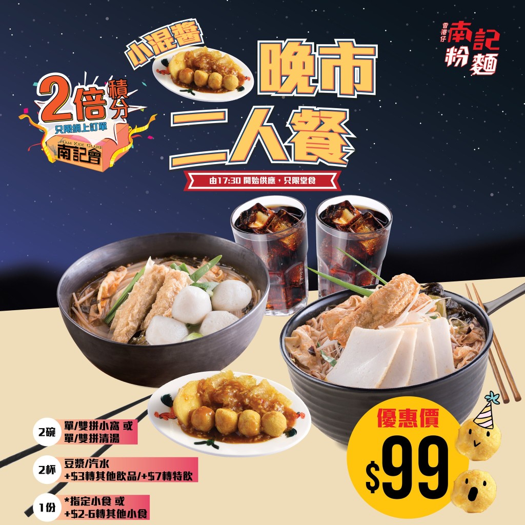 南記粉麵最近發布一款定價99元的晚間超值混醬組合,適用於線上預訂或現場用餐均可兌現。套餐內附兩份單式或雙拼清湯粉麵或小窩粉麵,另配一份固定小食(可額外加2至6元改選其他品項),並含兩杯豆漿或汽水(轉換其他飲料加3元,選特調飲品則加7元)。