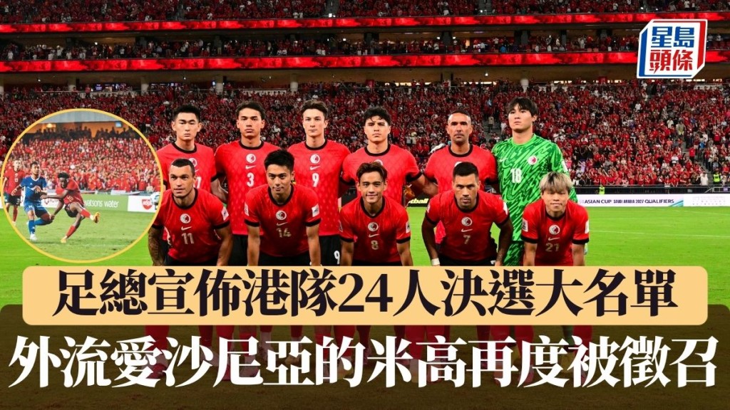 香港足球代表隊將分別在本月在13號友誼賽在香港大球場對上柬埔寨,18號亞洲盃外圍賽在啟德主場館主場迎戰新加坡,今日香港足總正式宣佈24人大名,上次無緣入選的鋒將米高將會回歸,41歲的𠎀志門將王振鵬亦相隔3年再度獲選。