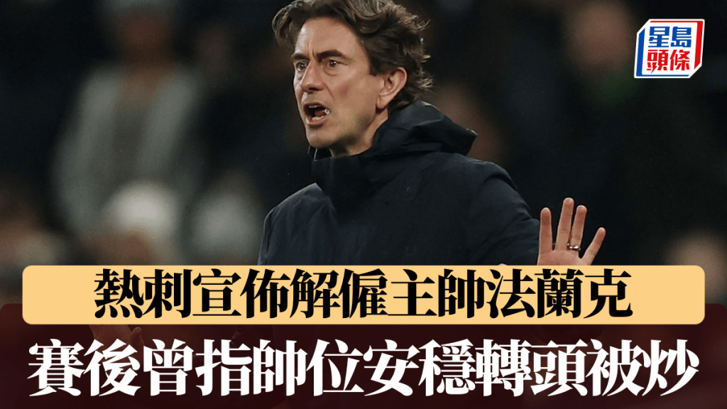 英超球會熱刺(Tottenham Hotspur)周二晚在主場以 1-2 不敵紐卡素後,翌日(11日)正式宣佈,解除主教練湯馬士法蘭克(Thomas Frank)的職務。這位丹麥籍教頭在敗予喜鵲的聯賽後稱日前才與球會管理層會面,並稱自己獲老闆支持繼續執教,怎料不足24小時後就官宣被炒。