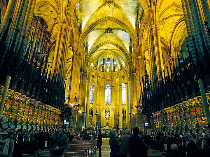大家此刻步入教堂,準會給其超高樓底及華麗雕塑吸引過來,左右兩旁的二十五個小教堂,絕大部分都飾以精美漂亮的雕塑及宗教畫作,駐足前面細意欣賞,便能消磨半天!可是說到最讓人目瞪口呆的,就是在教堂中央的合唱團廂座,這些隨着教堂主要部分在十四世紀竣工的廂座,不但擁有精美造工,更因十六世紀初成為金羊毛騎士團的會議場地而名噪一時,據悉當年參加會議的,除有作為東道主的西班牙國王卡洛斯一世,還有英國、法國、匈牙利、葡萄牙及丹麥等國君,而不同國家及貴族與會者的家徽樣式,現在都可在這些合唱團廂座上看到,吸引不少遊人在此「打卡」留念。