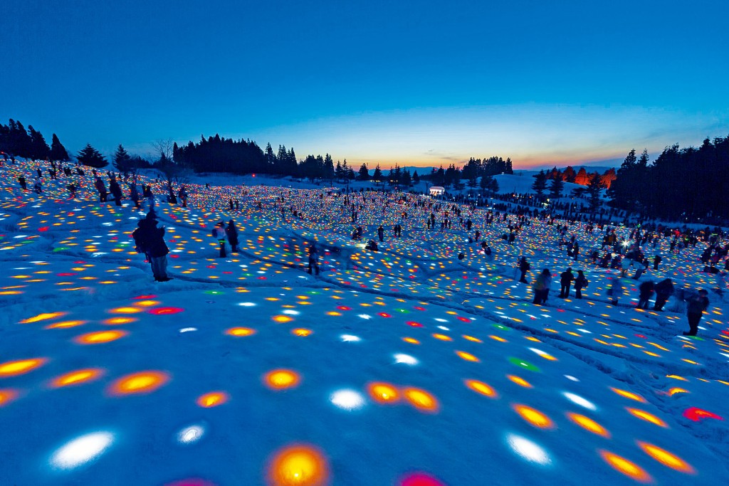 說到整個「越後妻有2021冬 SNOWART」,最受人注目的活動,肯定是將於3月6日舉行的越後妻有雪花火Gift for Frozen Village 2021。這個已是第八年上演的活動,顧名思義,是個在雪地上發放煙花的盛典,當天來到當間高原度假村(須額外付入場費),便可賞到五千多發大型煙花綻放的壯麗景觀。為令場面更覺夢幻,藝術家高橋匡太與音樂家mica bando,更攜手在白皚皚的雪地上創作出光之花畑場景,每位入場觀眾都會獲發一顆LED燈,這顆LED燈除可作為迷你電筒使用,更是一顆「光之種子」,原來觀眾們可按着LED燈的顏色及雪地上的指示,把燈放在預先畫上數百個直徑三米至八米圓圈的雪地上,呈現出浪漫繽紛的光之花畑景觀,成為一件超大型互動藝作。