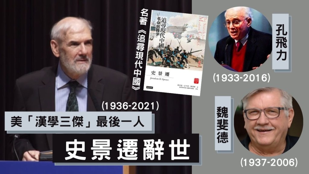 被譽為美國「漢學三傑」最後一人的耶魯大學榮譽教授史景遷(Jonathan D. Spence),於美國時間2021年12月26日辭世,享年85歲,他生前與孔飛力(Philip Alden Kuhn)(1933至2016年)及魏斐德(Frederic Evans Wakeman)(1937至2006年)被視為美國近代最重要的三名漢學家,對中國近代史有深刻獨到的研究,也是西方認識中國的重要基礎。