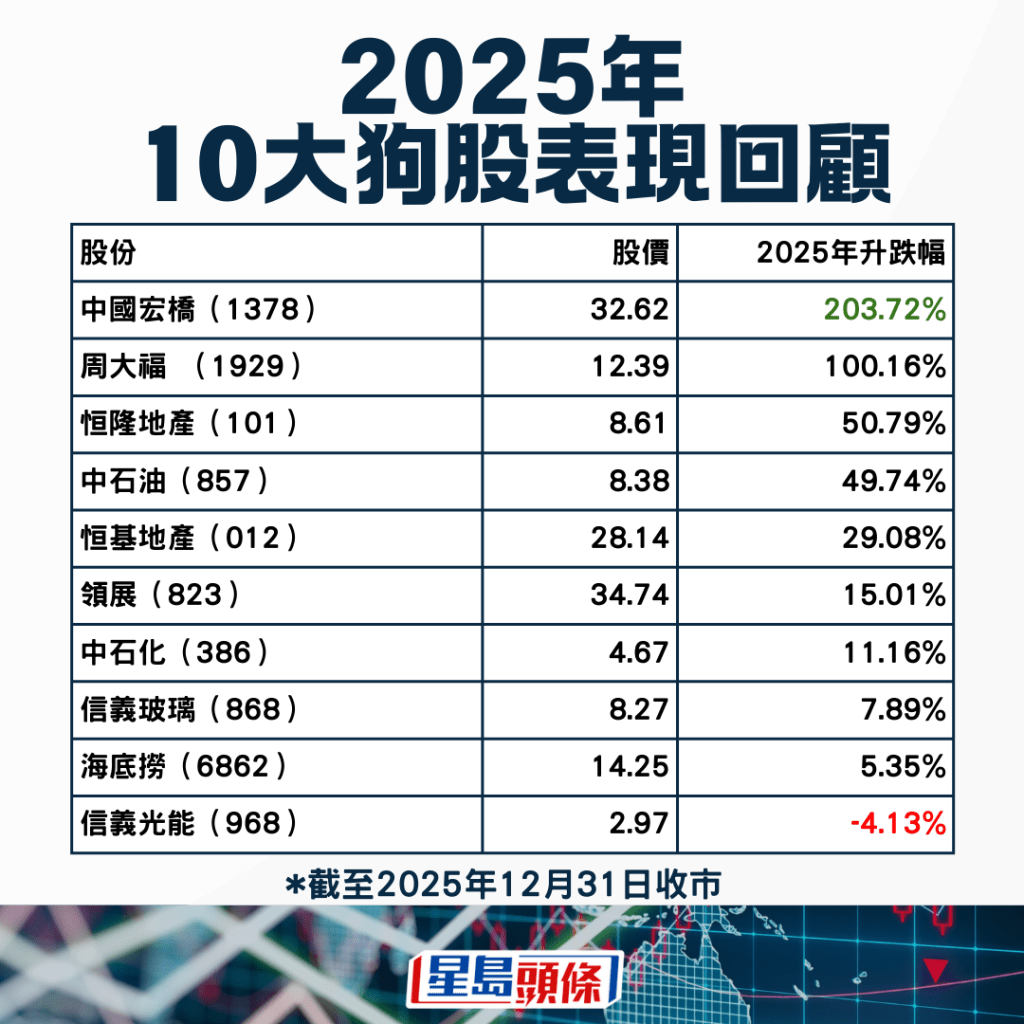 【港股/狗股】適逢2026年開始,港股第一日便先拔頭籌,勁升700點取得開門紅,而「狗股」策略(Dogs of the Dow)再度成為投資者的焦點,紛紛希望找到高息兼有潛力大幅反彈的股份。回顧2025年,狗股策略大獲全勝,其中表現最好的股份升幅更超過兩倍。展望2026年,新一份10大狗股名單出爐,當中不乏「中特估」、能源及消費等板塊。香港股票分析師協會理事溫傑接受《星島頭條》訪問時指出,狗股策略具一定道理,但強調選股仍需以基本因素行先,並點評當中三隻股份值得留意。