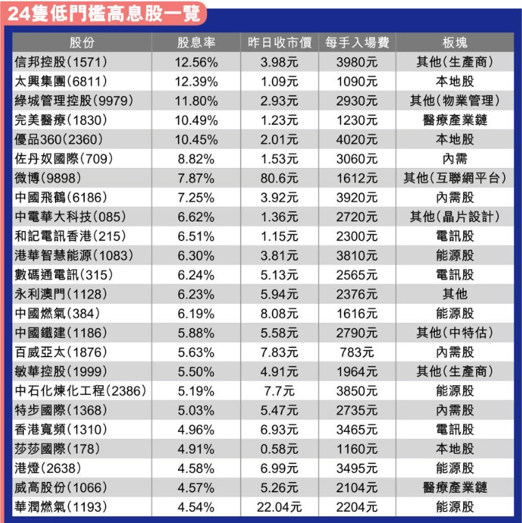 低門檻高息股尋寶 最高逾12厘 4000元入場涵蓋各行業 最平藍籌股一手僅800元