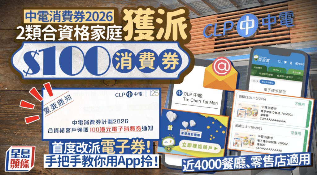同場加映: 中電消費券2026改派100電子券教你用App領取長者電費優惠低用電量客戶有份4000商戶有優惠