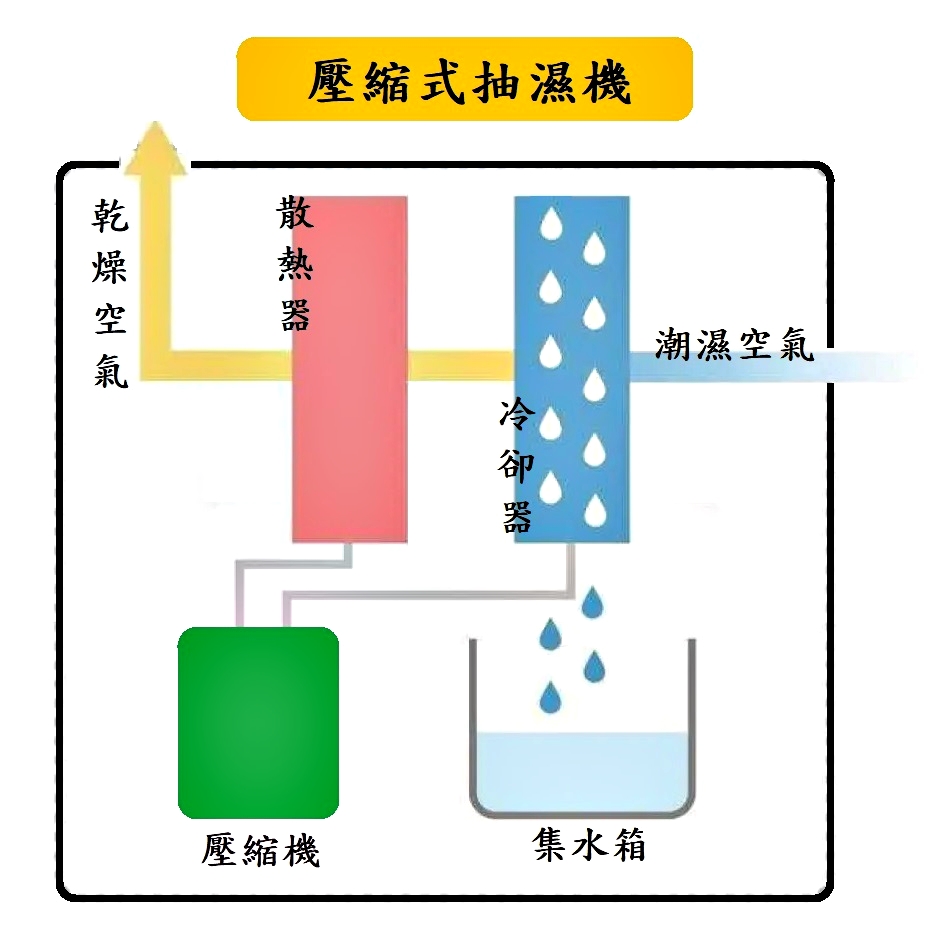 ·冷凝除濕:空氣流經冰冷的冷卻器(冷排),其中的水氣遇冷凝結成水珠(如同冷的飲品罐放置在室溫下表面凝結水珠)。