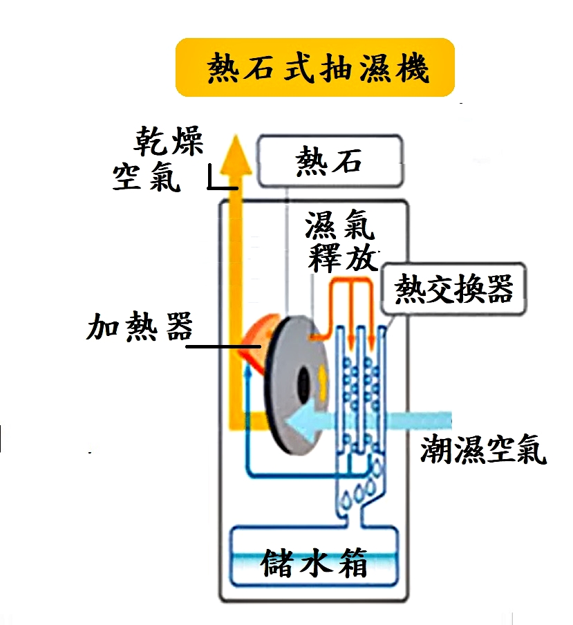 ·吸濕階段:潮濕空氣被吸入接觸「熱石」(通常是泡沸石),熱石結構吸收空氣中的水分。