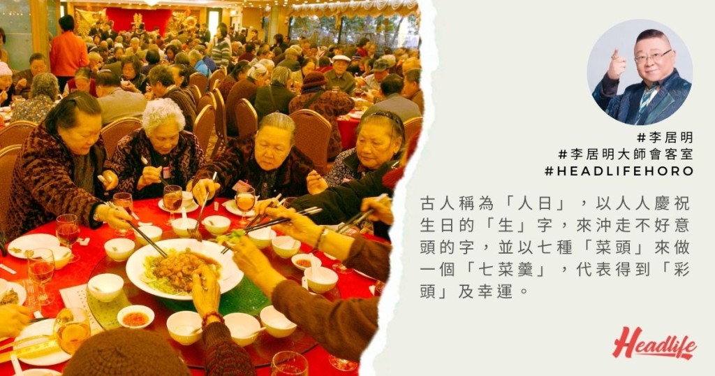 為何初七稱「人日」?因為中國對「七」好忌諱,七數乃靈界數。廣東人忌七碟菜,代表家中有人往生。所以,新春亦很避忌「初七」這個日子,古人便稱之為「人日」,以人人慶祝生日的「生」字,來沖走不好意頭的字,並以七種「菜頭」來做一個「七菜羹」,代表得到「彩頭」及幸運。這一碗羹極盡好意頭,菜市場有得賣!這是大年初七,家家戶戶都要做足的行運秘方。