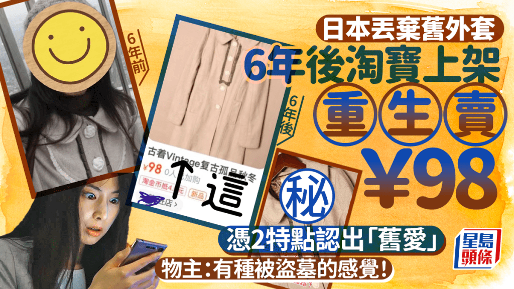 多年前丟棄的外套竟然在淘寶出現?近日,一名居住在日本的台灣網民在社交平台上發文分享,指她多年前在日本丟棄的一件外套,竟然在淘寶「復活」上架,還被標價¥98出售!該台灣網民憑藉2個特徵,一眼認出這是自己的舊物,讓她憤怒直言:「有種被盜墓的感覺!」即看下文了解詳情。