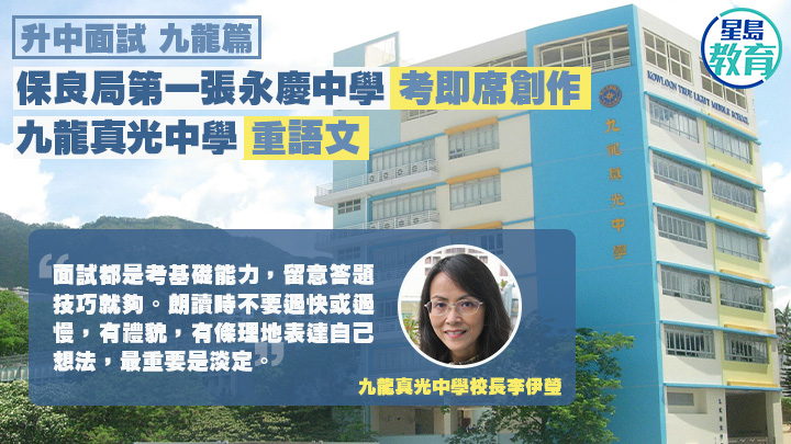 今日介紹3所「全開英文班」中學,均位於九龍區,其中位於黃大仙區的保良局第一張永慶中學,中文面試部分除考成語,申請人更須即席作故事,考驗創意;另外2所中學位於九龍城區,其中旅港開平商會中學,面試時除探討學生想法,亦會邀請合適的申請人作體能測試;至於女校九龍真光中學,則設中、英文及綜合面試,當中包括朗讀和提問,了解申請人的語文基礎。