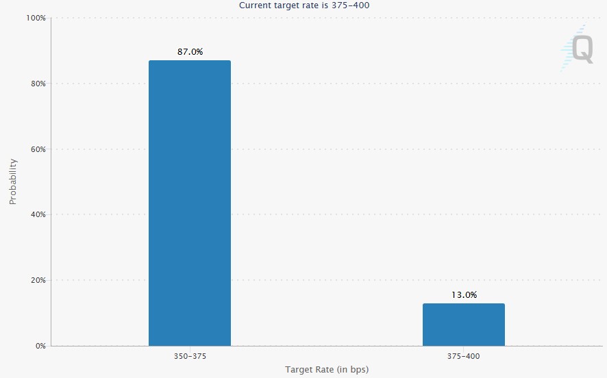 據芝商所FedWatch最新顯示,12月減息0.25厘的機會率,最新為83%,維持利率不變的機會則為13%。