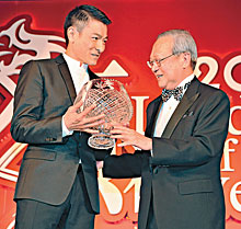 Andy Lau, left, receives his award from Norman Leung, executive chairman of Television Broadcasts Limited, in the Sports/Culture/Performing Arts category. |