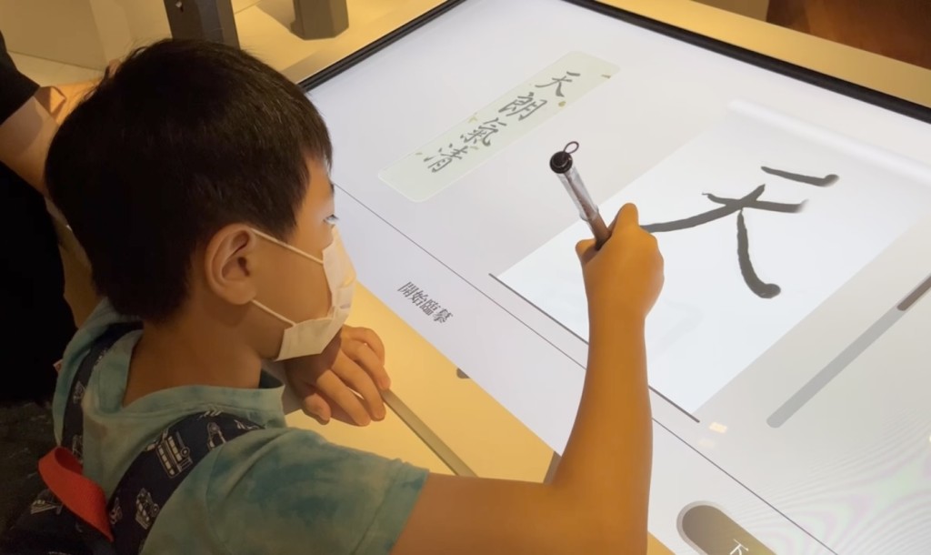 「清代宮廷生活」展廳亦設有電子毛筆,小朋友可以跟着樣本,自己拿起電子毛筆臨摹。完成後,可要求系統把電子作品傳送到自己的電郵,留為紀念。拿起毛筆,小朋友就知道要寫得一手好字,一點也不容易啊!