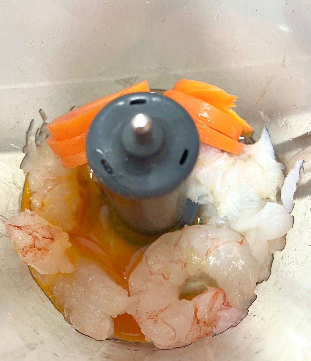 2. 鱈魚、蝦、紅蘿蔔及雞蛋放入攪拌機打勻。