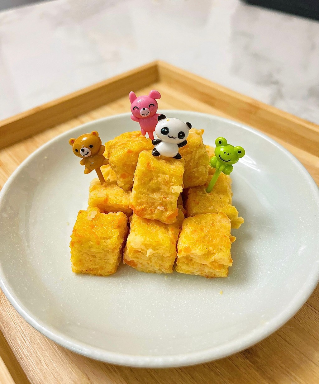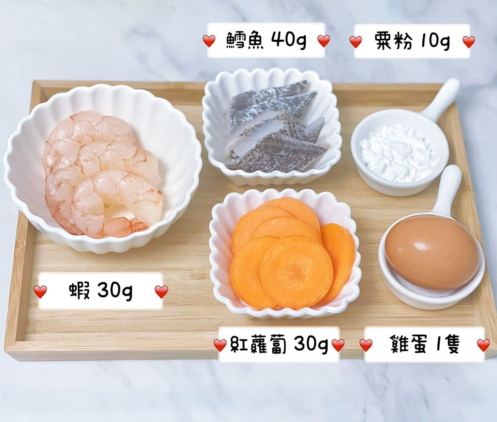 這個幼兒食譜備有海鮮與蔬菜,不用調味,簡單下粟粉將之黏合成形便可,保證每口都是食材原味。又由於紅蘿蔔已經混合其中,讓一向不愛吃蔬菜的寶寶都可以安然大口吃下;想逗寶寶多吃幾口,更可於賣相下點功夫,用不同形狀模具印出可愛形狀,甚或像相片中放上不同造型的叉子,同樣吸睛,相信小朋友都會喜歡。
