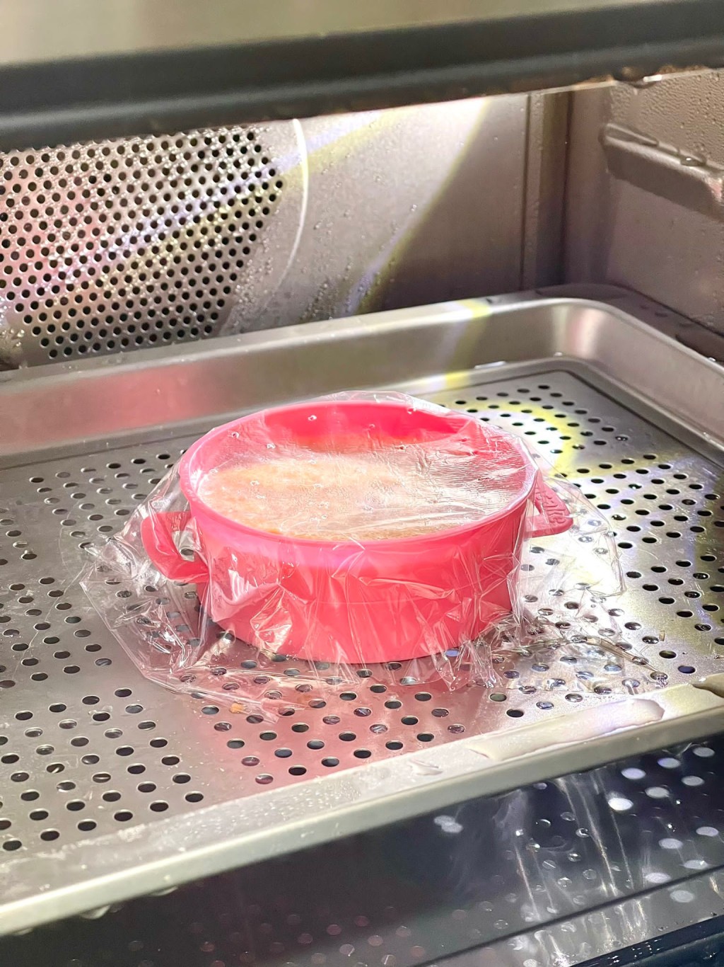 5. 鋪上保鮮膜,膜上刺些小洞,蒸二十分鐘後關火焗三分鐘便成,再脫膜切出自己喜歡的圖案。