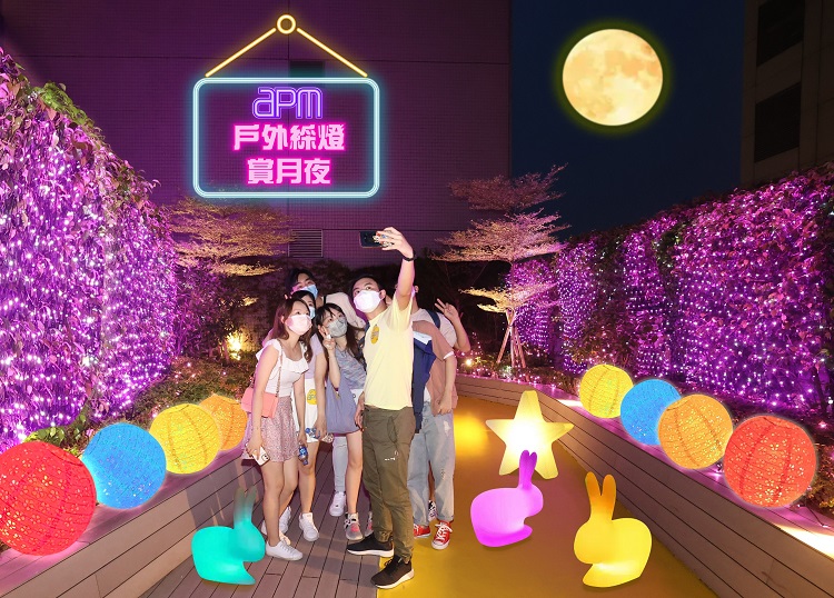 apm不但設有戶內賞月裝置,戶外花園亦擺滿發光月兔,並設置了十五呎燈泡巨人雕塑,以及LED光影舞動搖搖板等發光遊樂設施,充滿節日氣氛,讓一家人於星空下玩燈籠、打卡,盡享佳節相聚時光。