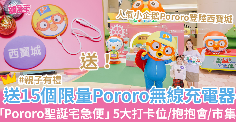 仲有不足兩星期就到聖誕節,打卡商場一個接一個,今次輪到韓國人氣高企的小企鵝Pororo出場!小企鵝Pororo於這個聖誕登陸西寶城,呈獻全港首個「Pororo & Friends聖誕宅急便」主題裝置,不但有2米高Pororo吹氣大頭、4米高禮物速遞站,更為小朋友舉行一連串聖誕快閃限定活動,「Pororo限定抱抱見面會」、「快閃兒童聖誕合唱團」、「聖誕DIY 手作兒童市集」等!《親子王》更送出限量Pororo無線充電器,想知如何得到?即睇!