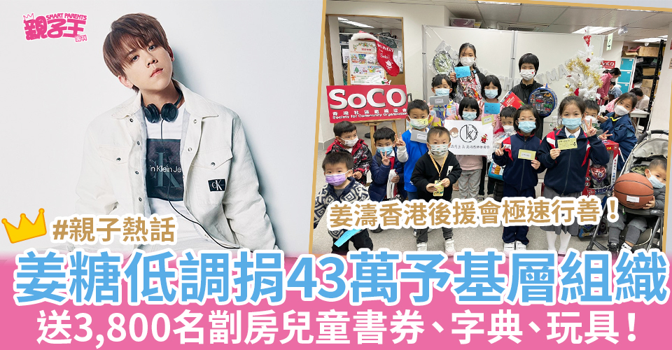 MIRROR男組合成員姜濤向來熱心行善,不時呼籲姜糖(姜濤粉絲)多做善事,《星島網》日前報道社協因「疫後3年」效應,每年舉辦的基層兒童贈送聖誕禮物活動告急,今年捐款目標較去年大減8成,至今日(21日)籌款截止前2日,社協突然收到姜濤香港後援會來電稱看到有關報道後,低調捐出43萬元,用以為劏房兒童購買書券、鞋券、字典、及棉被等必需品,讓至少3,800名小朋友可以度過一個有溫度的聖誕。