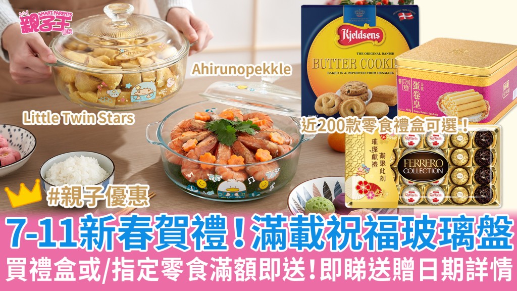 由 2024 年 1 月 22 日早上 7 時起,於 7-Eleven 分店^購買新年禮盒或指定零食滿$208*,即送「Little Twin Stars 或 Ahirunopekkle 滿載祝福玻璃盤」1 款,款式隨你選擇,數量有限,送完即止。以 Borosilicate 玻璃製造的「滿載祝福玻璃盤」,耐冷耐熱,可以放入微波爐、焗爐使用,更印有圓滾滾的 Little Twin Stars 和 Ahirunopekkle 圖案,實用又美觀, 喜歡下廚的粉絲們絕不能錯過!立即到 7-Eleven 購買賀年禮品,指定零食都包,兼帶走精緻又CP值極高的「滿載祝福玻璃盤」啦!