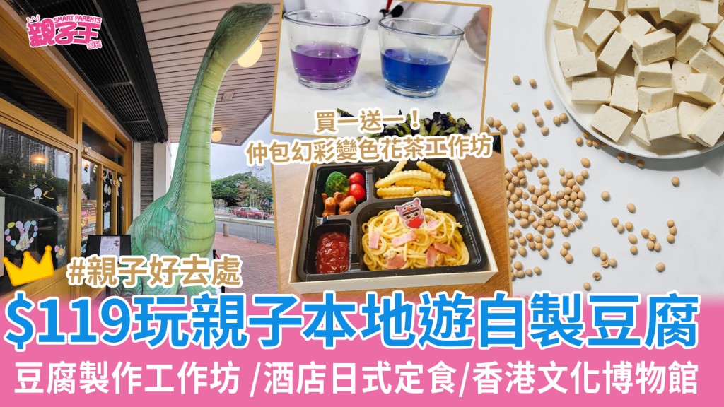 親子好去處2024︳想跟小朋友輕輕鬆鬆玩一日,除了去室內遊樂場、主題樂園,其實還有不少親子好去處,既可邊玩邊學,還能認識歷史文化。今日就有旅遊博覽展限定優惠,快閃優惠買一送一$119即可參加豆腐製作工作坊,還可到酒店吃豐富定食,再參觀香港文化博物館,即刻搶購!