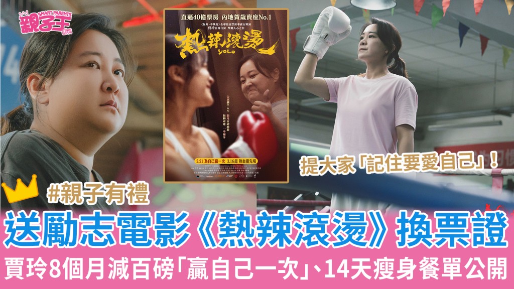 由中國知名持人兼演員導演賈玲主演的《熱辣滾燙》改編自日本電影《100円的愛》,包辦導演的賈玲為了《熱辣滾燙》由105公斤(約231磅),以一年時間邊拍邊瘦身,終激減50公斤(約110磅),早前推出第一首歌曲〈一切都來得及〉,更以減肥成功的蛻變標準身形、約55公斤(約121磅)拍攝MV,為大家帶來耳目一新的效果!賈玲希望透過這部電影令女生們「記住要愛自己」,《親子王》將送出這套勵志電影《熱辣滾燙》換票證30張,再附上賈玲的14天瘦身餐單,讓大家一起「贏自己一次」,做個更好的自己。