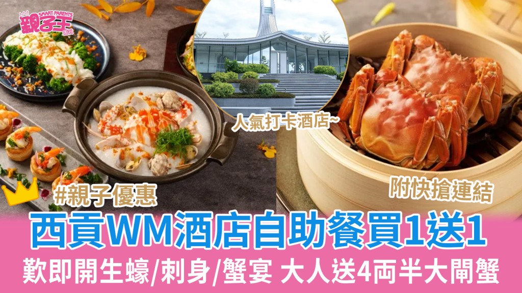 自助餐優惠︳10月、11月是小朋友測驗期,周末想帶小朋友去鬆一鬆也不敢到深圳、澳門等地外遊,不如就帶他們到西貢悠悠閒閒享受初秋微風。西貢為熱門旅遊點,想舒舒服服跟小朋友用餐,可考慮西貢市中心的WM酒店,環境清幽寧靜,予人有遠離城市的真正度假風!酒店處處打卡位,更有自助餐優惠推出,可以買一送一優惠享用最新「金秋蟹香自助晚餐」的肥美秋蟹!每位大人更送上4両半大閘蟹呢!各位蟹控即睇搶飛連結,預約定小朋友去歎蟹!