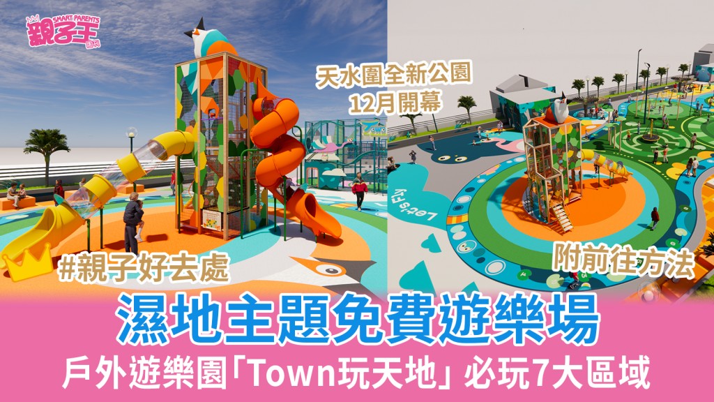秋涼了,是時候帶孩子到戶外走走,好好享受陽光兼放電,吸收多點維他命D,既健康又好玩。近年不少地區的免費遊樂場都有更新了,加設了不少極富趣味的設施,於12月份又有一公園開幕喇!全港首個以天水圍濕地為主題的戶外遊樂園「Town玩天地」將於12月登陸T Town北館頂層,佔地32,000平方呎的免費遊樂園區,由獲獎無數的設計團隊One Bite操刀,劃分為7大區域,涵蓋9項主題遊樂設施,適合3至12歲小朋友盡情放電,邊玩邊認識豐富多樣的濕地生態。