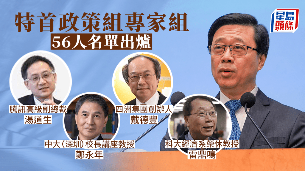 政府今日(5月30日)公布特首政策組專家組名單,合共56人,分為經濟發展、社會發展及研究策略3個小組,其中經濟發展組成員包括恒基地產主席李家誠、新鴻基地產執行董事郭基煇、金融發展局主席李律仁,亦有國家開發銀行香港分行行長李曦光、騰訊高級副總裁湯道生、德勤中國首席執行官曾順福;社會發展組成員包括四洲集團創辦人戴德豐、團結香港基金前總裁鄭李錦芬、港區人大代表陳曉峰、楊德斌等。