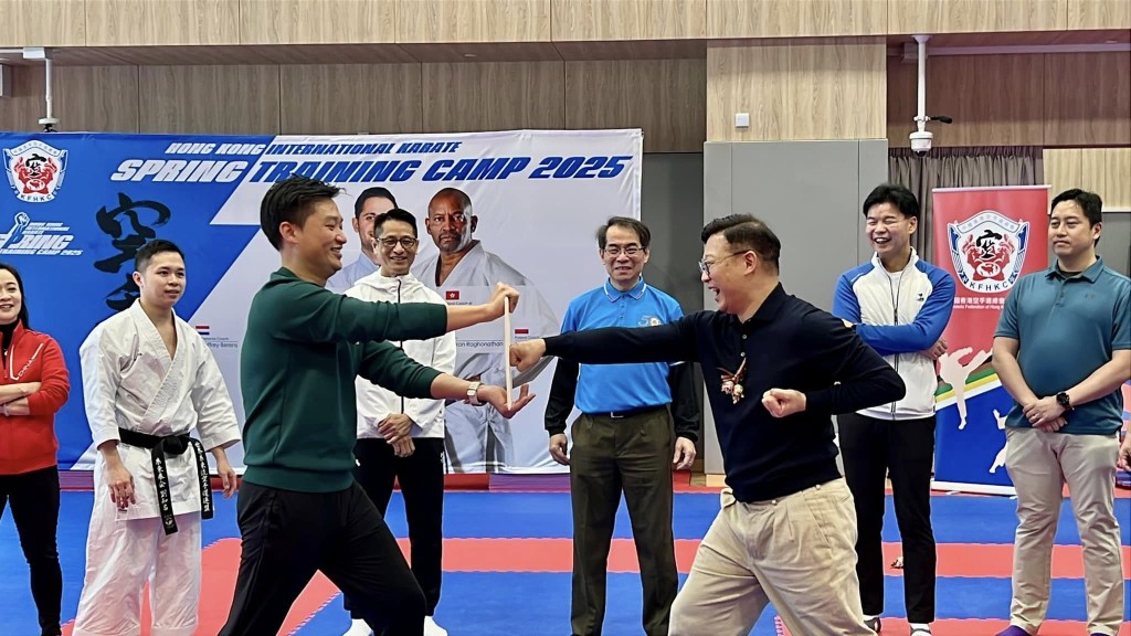 特區政府多名官員熱愛體育運動,律政司副司長張國鈞在社交平台發文,指今日(9日)出席國際空手道訓練營活動,並與來自世界各地優秀的空手道運動員和教練見面,期間更示範「空手劈木板」。片中所見,張國鈞展示出以「直拳」劈木板;而手持木板的立法會議員鄭泳舜亦展示出「演技」,木板被劈斷時一度抱腹、「打到褪後幾步」。