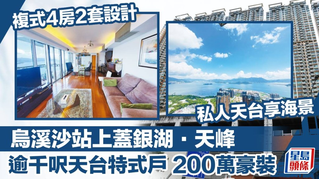 港鐵烏溪沙站上蓋的銀湖.天峰,擁交通便捷優勢,今日為大家介紹屋苑5座頂層連天台單位,實用面積1668方呎,複式4房2套設計,業主曾斥資200萬元裝修,最大賣點私人天台覽開闊海景,最新叫價 3,700萬元,可公司股份買賣 。