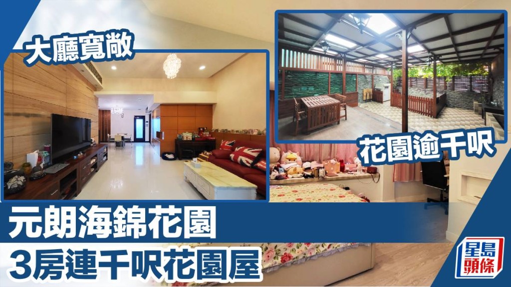 元朗洋房屋苑海錦花園,毗鄰 錦田河及南生圍,起居環境寧靜優美。今日帶大家參觀屋苑其中一座洋房放盤,實用面積1320方呎,樓高3層,3房2套連工人房設計,全屋附有靚裝,最大優勢是連 1161呎花園,最新叫價1,600萬元。
