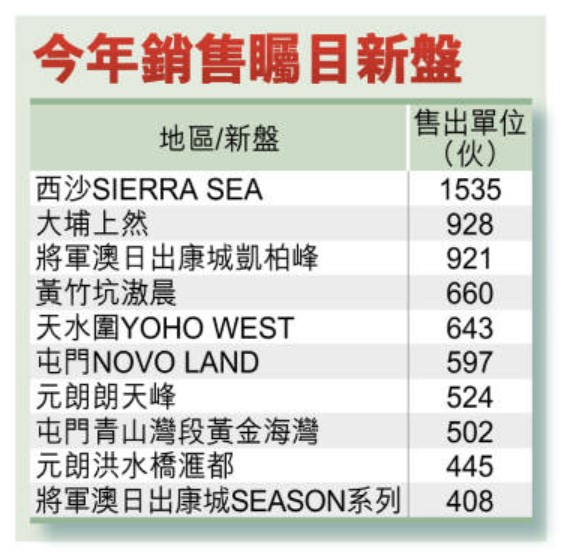 新盤今年受到多方利好消息帶動,發展商銷售成績理想,今年至今新盤已錄得約1.58伙成交,已打破去年全年約1.57萬伙的成績,增加約0.6%。在眾多新盤中,以新地旗下西沙SIERRA SEA銷售成績最為理想,合共售出逾1500伙,亦是唯一銷售達千伙的新盤。有業界人士表示,在政府推出有利樓市消息推動下,加上減息、樓價觸底等因素刺激,令今年新盤銷情理想,料全年新盤成交宗數可達2萬宗水平。