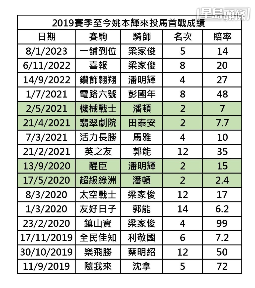 姚本輝近年養馬量穩定,長期於六十駒或以上,來投馬不算多,二○一九賽季至今十六匹先後出賽,二○一九賽季最多,七匹來投馬初出,只得「超級綠洲」得第二;大前季六駒,則有「醒臣」、「翡翠劇院」及「機械戰士」入Q,前季無馬來投,而上季三匹來投馬,其首戰未能入圍。