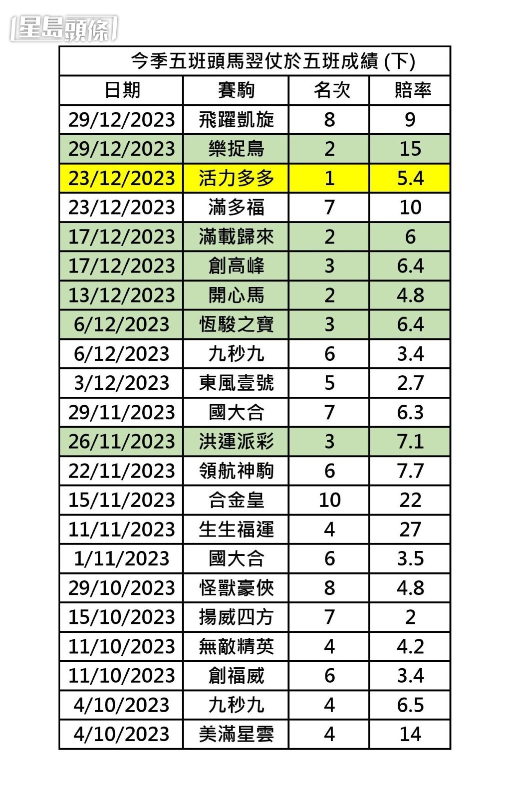 先講二○二三年,二十二匹五班新勝馬,直至十二月二十三日,才憑「活力多多」打破悶局取得連捷,其餘亞軍及季軍各三駒。