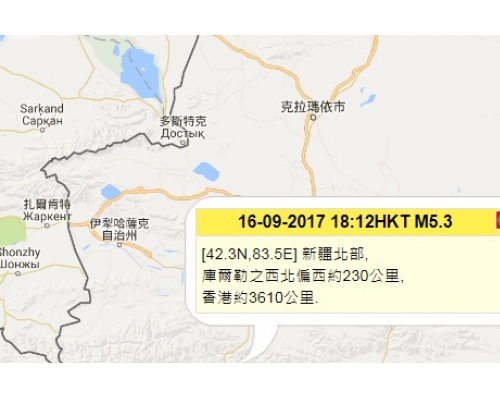 香港天文台錄得新疆北部,庫爾勒之西北偏西約230公里,發生黎克特制5.3級地震。