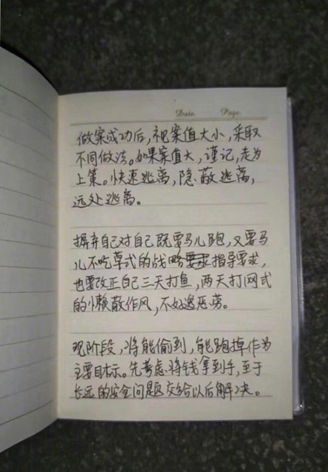 另外,小偷亦寫上自我督促的語句,「摒棄自己對自己既要馬兒跑,又要馬兒不吃草式的戰略指導要求,也要改正自己三天打魚,兩天打網式的懶散作風,不好逸惡勞」。