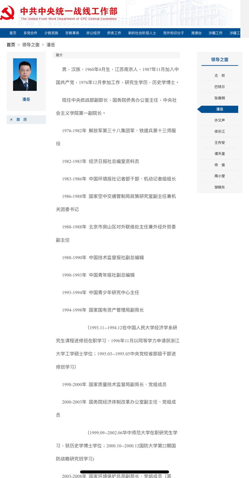 潘岳是中共「紅二代」,本身是著名理論家,在政治、宗教、文化、環保等多個領域都有研究,曾經力挺時任福建省長的習近平總結「南平經驗」。他擔任國家環保局副局長期間掀起「環保風暴」,得罪既得利益集團,仕途一度邊緣化,但獲最高領導人賞識,提拔為正部級,如今出掌僑辦,實權大增。