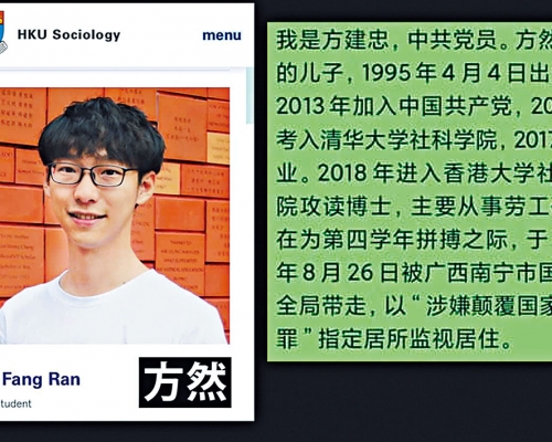 (星島日報報道)研究勞工議題的香港大學社會系博士生方然(見圖),上月二十六日在廣西南寧市遭國安人員「指定居所監視居住」,他被指涉嫌「煽動顛覆國家政權罪」。港大發言人回應查詢時稱:「校方已得悉事件,並正在積極跟進。我們會向方先生及其家人提供適切協助。」