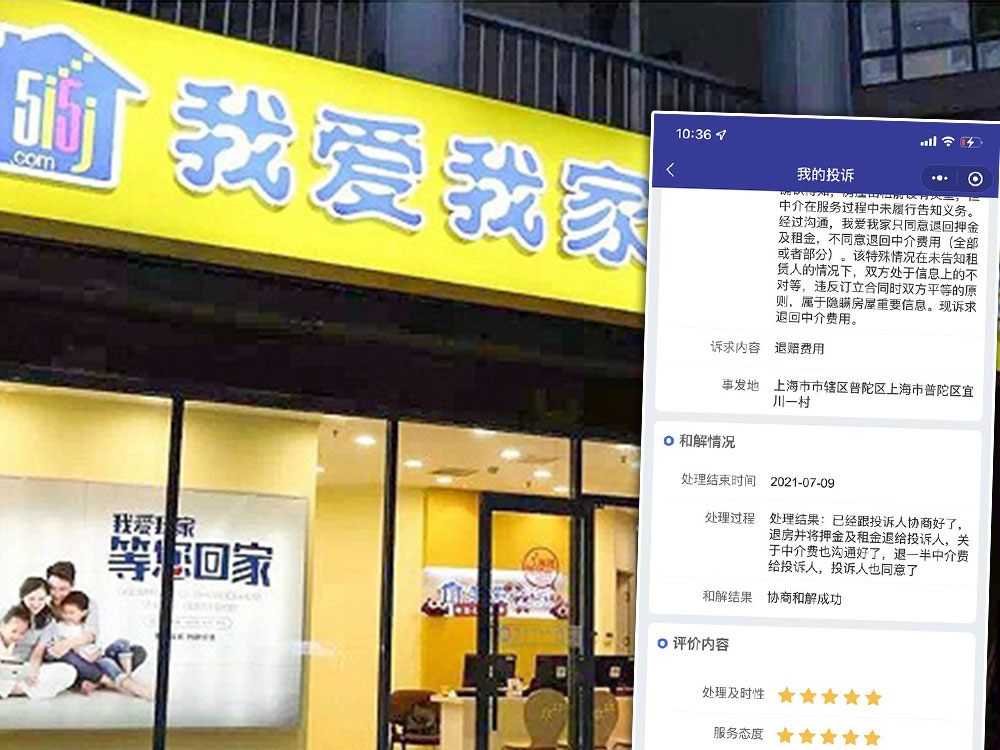 「我愛我家」原先拒絕退還中介費,但丁先生在「12315線上投訴平台」投訴後,對方聲稱願意退還一半中介費。不過,事隔5個月,「我愛我家」仍未履行承諾,丁先生未收到款項,也聯絡不上相關負責人,其後經記者聯繫「我愛我家」的負責人,對方才表示會積極處理,並於12月15日雙方簽訂和解協議,同意在7個工作日內向丁先生退還一半中介費800元人民幣。