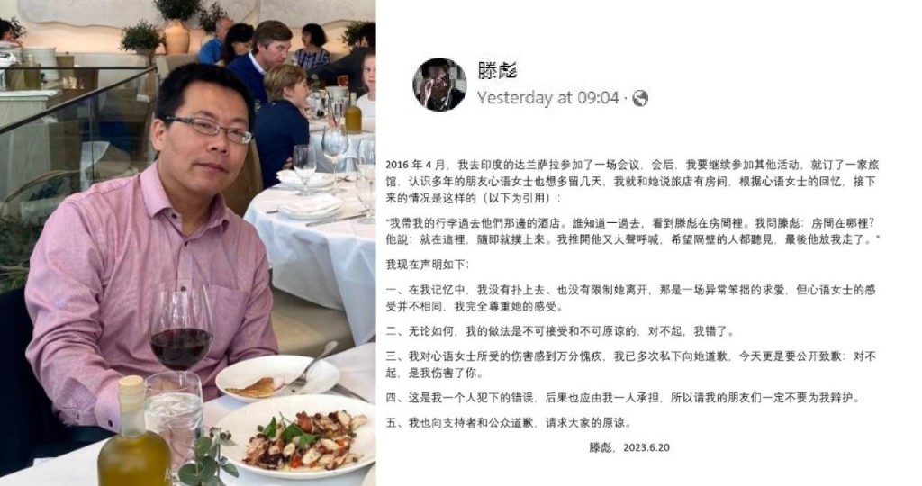 滕彪在臉書(Facebook)寫出一則往事並發出5點聲明。他在2016年4月前往印度的達蘭薩拉參加會議,會後想參加其他活動,就訂了一家旅館,認識多年的朋友心語女士也想多留幾天,於是就和她說旅店有房間。