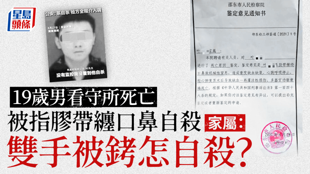 近日,湖南省邵東市葉先生反映稱,2021年6月,其19歲的兒子小葉在邵東市看守所羈押期間死亡。邵東市人民檢察院出具的鑒定意見通知書顯示,小葉是膠帶纏繞口鼻致機械性窒息。對此,葉先生提出質疑「他雙手被銬怎麼自殺?」大皖新聞28日報道,葉先生表示,看守所會見室有監控盲區,他至今沒有看到兒子有偷拿、藏匿膠帶和自殺行為的監控畫面,自殺的說法不合常理。